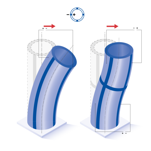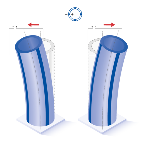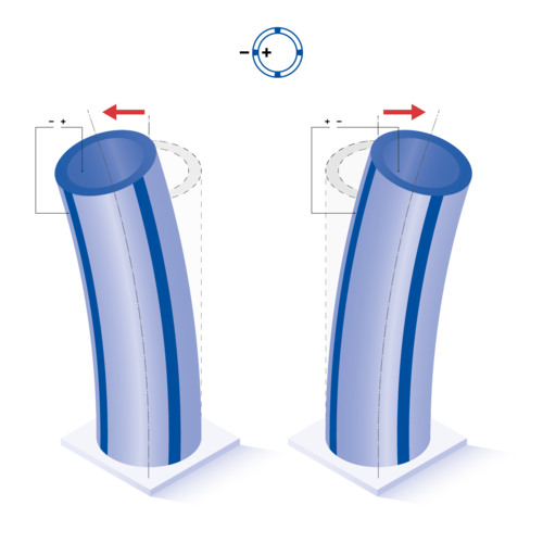 Für Rohre mit positiver Polarisationsrichtung innen und negativer außen ergeben sich z. B. folgende Auslenkungsrichtungen: