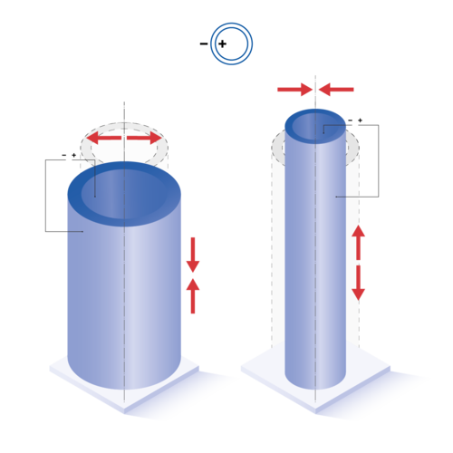 | Polarisierungsrichtung | Je nach Kontaktierung und Anbringung der Elektroden entstehen unterschiedliche Auslenkungen in axialer, radialer sowie lateraler Richtung. Weitere Informationen finden Sie unter >> Funktionsweisen. |