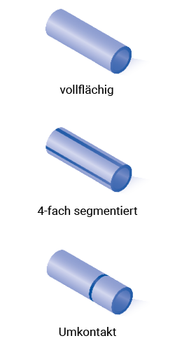 | Elektrodendesigns | Neben mehrfach segmentierten Rohren sind weitere Designs möglich, wie vollflächig, 4-fach segmentiert oder Umkontakt (siehe rechte Spalte). |